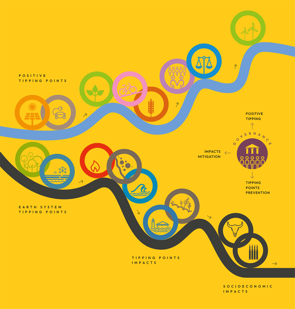 In the Tipping Points VCC, we are a Community of Practice aiming to improve the understanding of tipping points in the Earth system and humanity, find ways to avoid crossing negative tipping points and utilize positive tipping points for tackling major threats to the Earth's life-support system and all life on Earth. (Image below from https://global-tipping-points.org)